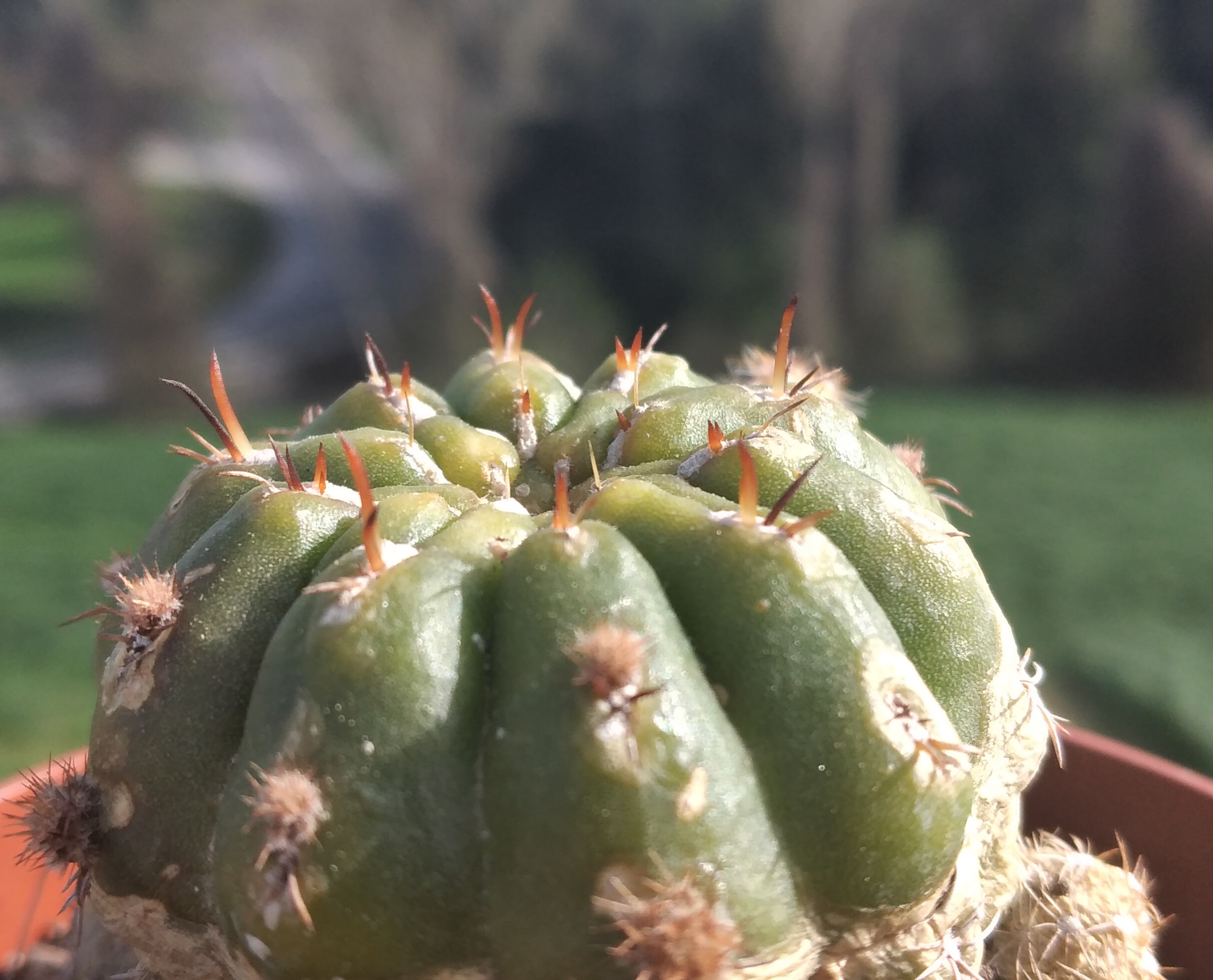 El cactus que avui us presento és la Matucana Auriantica subs. Polzii, anomenada vulgarment Matucana Polzii. És originària de les regions peruanes de Marañón i Huánuco. De mida petita i creixement lent, aquesta matucana requereix una exposició directa al sol i un clima sec i càlid, ja que no resisteix les temperatures inferiors a sis graus positius. Per aquest motiu, la temperatura ideal que hauria de tenir durant l’època de repòs, és d’entre deu i quinze graus positius. Durant els dies de sol més fort, és a dir, a l’estiu, es pot proporcionar una mica d’ombra mitjançant un para-sol per evitar possibles cremades, sobretot en exemplars joves. No creix gaire més de vuit centímetres de diàmetre per cinc centímetres d’altura. És un cactus perfecte per a tenir-lo a una jardinera al balcó d’un pis. Les flors acostumen a ser de color vermell molt vistós i tenir una grandària d’uns cinc centímetres de diàmetre. Pot variar del vermell al taronja i tenir una variació entre aquests dos colors (vermell ataronjat)I pel que fa al reg, és important regar-lo moderadament a la primavera sempre que s’hagi sobrepassat la temperatura de seguretat (cinc graus de temperatura mínima). A l’estiu, regar un cop cada quinze dies esperant que el substrat estigui completament sec. Quan comença el fred, és a dir a la tardor, regar un cop al mes i deixar d’aportar aigua durant tot l’hivern. Tornar a proporcionar aigua al començament de la primavera. S’ha de tenir en compte aquest punt perquè són especialment sensibles a l’excés d’humitat, ja que això farà que és podreixin les arrels. Finalment, les matucanes en general, acostumen a ser molt fàcils de reproduir, només s’han de separar els fills que van sortint tant a la base com al voltant de la mare. Si en sou un xic més experts, també es pot aconseguir a través de les llavors que ofereixen els fruits marrons que surten quan la flor ha mort.