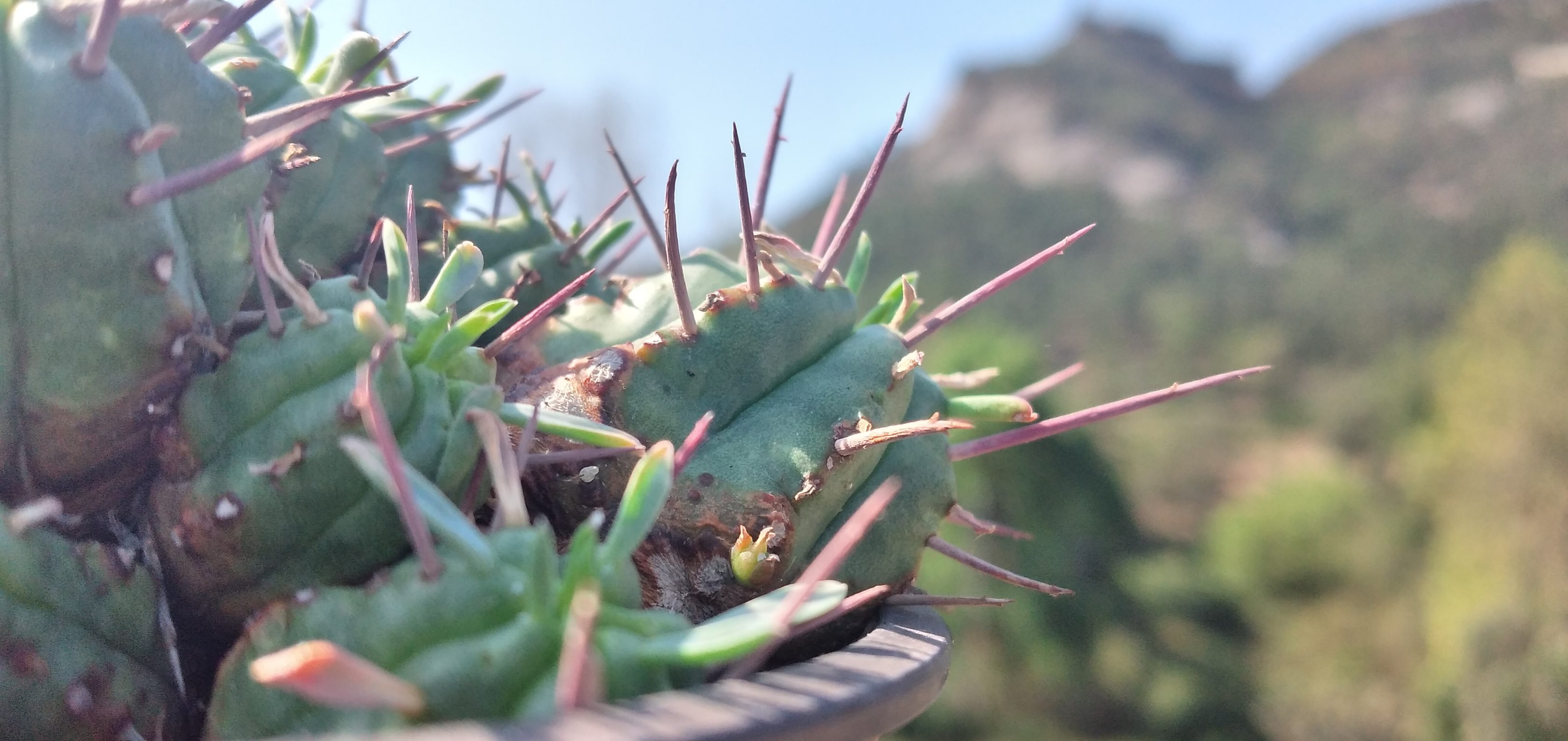 Les vores de les puntes dels brots s’intercalen amb els forats triangulars que creixen amb l’edat. Els brots que surten nous són verds, i a mesura que les seccions es van tornant velles, canvien a tonalitats marrons. Les espines estan distribuïdes de manera irregular i individualment i els costats de les tiges que són llenyoses, fan entre sis i vuit mil·límetres de longitud. Inicialment, les espines són de color vermellós o porpra, però, amb l’edat es tornen de color marró.