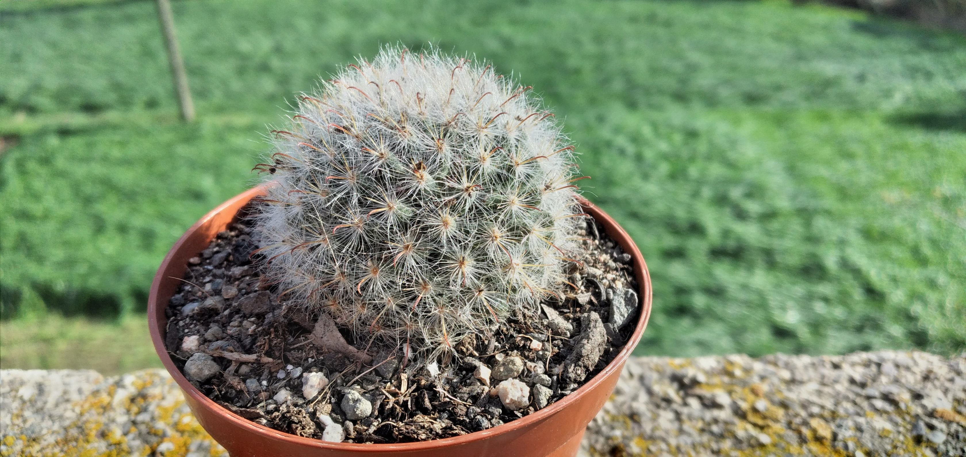 Avui us presento un dels cactus més coneguts i sobretot cultivats pel seu aspecte i la facilitat de cultiu. Es tracta de la Mammillaria Boscana o Bisnaga Boscana, que és com es coneix en algunes regions. Prové del centre i nord de Mèxic. Un punt curiós és que si aneu a buscar-lo al seu hàbitat natural, podria ser que no el trobéssiu, doncs com que creix en zones de roca volcànica i en zones àrides i semiàrides, amagat sota els arbustos amb substrat de roca calcària i pobres en matèria orgànica. La seva forma és esfèrica al principi, mentre creix continua sent esfèric, però té tendència a agafar forma cilíndrica, de color verd clar o blavós, tot i que té una aparença de bola de cotó fluix tant per la seva forma si te’l mires de lluny perquè sembla una muntanyeta i perquè tota la seva superfície està recoberta per uns pelets blancs sedosos. No us en fieu per aquest aspecte que té, que pot donar ganes de tocar-lo, ja que sota aquesta vellositat blanca hi ha les espines, que per variar són d’aquelles que acaben en forma d’ham (o de ganxo, com vulgueu dir-ho). Són d’aquelles que si se’t claven a la roba o a la pell directament tindràs molts problemes per treure-ho, pel fet que mentre en treus una totes les altres que estan al voltant us puc garantir que encara se n’enganxaran més. La seva mida de normal és de dotze centímetres d’altura per vuit de diàmetre. Té entre trenta i cinquanta espines radials blanques i entre una i set de centrals. Les flors, creixen en forma d’embut i poden ser de colors variats: blanc cremós, groc cremós o rosat. Surten a la primavera i estiu formant una corona. El fuit és cilíndric, de color rosat-vermellós d’uns tres centímetres de llargada i quan passa l’estiu, forma unes llavors també vermelloses. Per anar acabant, el reg ha de ser més aviat escàs, un cop cada quinze dies tant a la primavera com a l’estiu. A la tardor i hivern deixar d’aportar aigua. Un apunt important és que quan es regui, que l’aigua no toqui el cos del cactus ni les flors en època de floració, ja que es poden marcir amb molta rapidesa. Un problema que sol presentar és que si reguem en excés sobretot a l’hivern (això només es pot aplicar en zones on el reg a l’hivern es pot aplicar perquè les temperatures mínimes són de deu o quinze graus positius), es pot inflar i descontrolar-se al moment de créixer a la primavera i estiu. Suporta temperatures mínimes inferiors als cinc graus negatius. Si durant tot l’any té una bona il·luminació (llum directe a l’exterior o semiombra) sempre respectant les hores més fortes del dia, ja que pot provocar cremades greus. No obstant això, hem de tenir en compte les plagues com l’aranya vermella o el cotonet (cotxinilla cotonosa) o la podrició de les arrels.