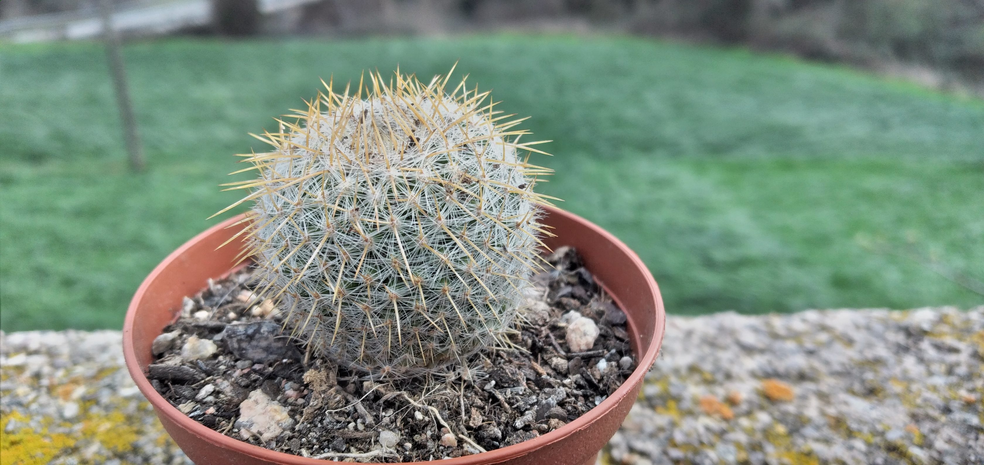 Aquí tenim un cactus considerat estrany. Es tracta de la Mammillaria Dixanthocentron més coneguda com a Bisnaga dues espines grogues o cactus pinya. És solitari i globular al principi i amb el pas dels anys passa a ser cilíndric i a créixer entre vint i trenta centímetres d’alçada. El nom de dues espines grogues li ve per les dues espines centrals que generalment són grogues, tot i que poden ser també des del blanc vermellós passant pel blanc marronós. Després té unes quantes espines radials que no sobresurten tant com les altres. D’aquestes n’hi ha entre quinze i vint. Quan són petits i es comencen a formar les punxes, la llana és escassa, però a mesura que es va creixent de manera cilíndrica, es desenvolupa cada vegada més la llana (entre això i la llargada de les espines centrals li atribueix el nom de “cactus pinya”). Pel que fa a la flor és considerablement grossa si tenim en compte la grandària del cactus. Fa entre vuit i deu centímetres de llarg i entre cinc i deu d’amplada variant colors de vermell intens a un vermell rosat pàl·lid. Quan aquesta es marceix, surt una petita fruita groga per sota i taronja pel damunt i seguidament les llavors marrons que es poden fer servir per crear nous exemplars a la primavera. Li agrada rebre llum solar directe, ja que això fomentarà la floració i el seu desenvolupament, però tampoc li desagrada una mica de semiombra a les hores centrals del dia, el qual el sol és més fort i pot cremar el cactus. Finalment, el reg ha de ser abundant a l’estiu i primavera (sobretot en època de creixement) i ser escàs o nul a la tardor i hivern (a la tardor es pot regar un cop al mes, però en el moment que les temperatures són inferiors a set graus positius deixar d’aportar aigua). Hem de controlar el reg en el sentit que abans de regar ens hem d’assegurar que el substrat està completament sec, per això si no es rega cada setmana a la primavera i estiu, es pot fer un cop cada quinze dies. Si no respectem això, el cactus pot ser propens a podrició i posterior mort. És sensible a les glaçades, millor no exposar-lo a temperatures mínimes inferiors de cinc graus positius.