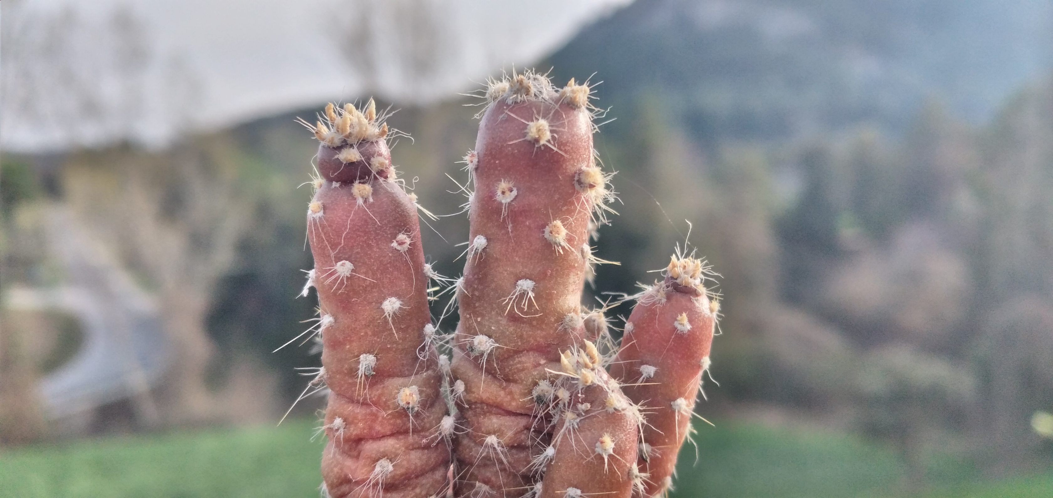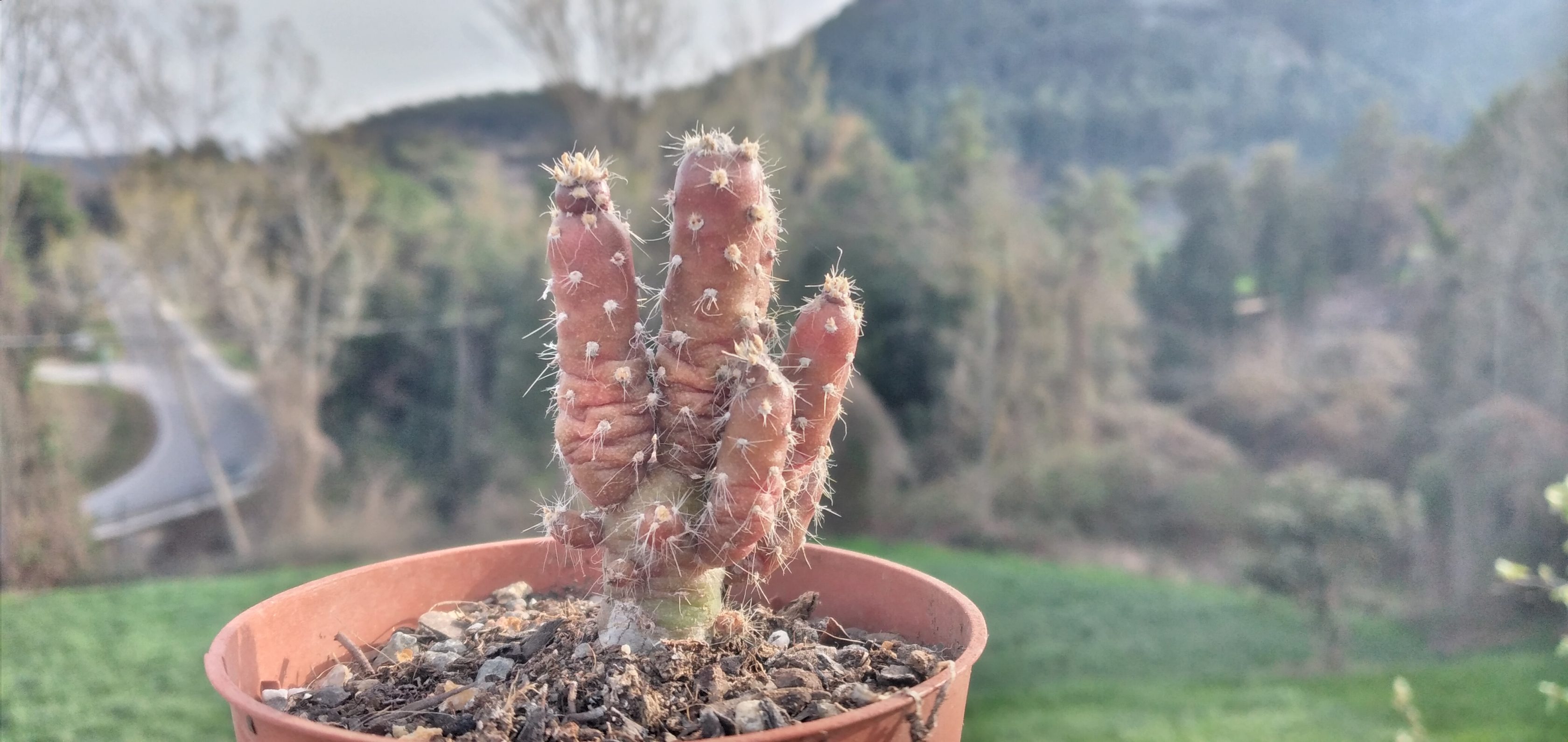 Aquí tenim la Opuntia Subulata i és coneguda arreu del món amb el nom d’agulles d’Eva. És un dels cactus més famosos i comuns que hi ha. És una planta robusta, de port arborescent (que té un creixement similar a un arbre) i molt ramificat que creix en alçada aconseguint normalment entre dos i tres metres fàcilment o arribant fins i tot en casos especials als quatre o cinc i tenint un diàmetre d’entre deu i quinze centímetres. Els brots que surten a les puntes són allargats i força fràgils. Poden créixer fins als cinquanta centímetres de llarg.