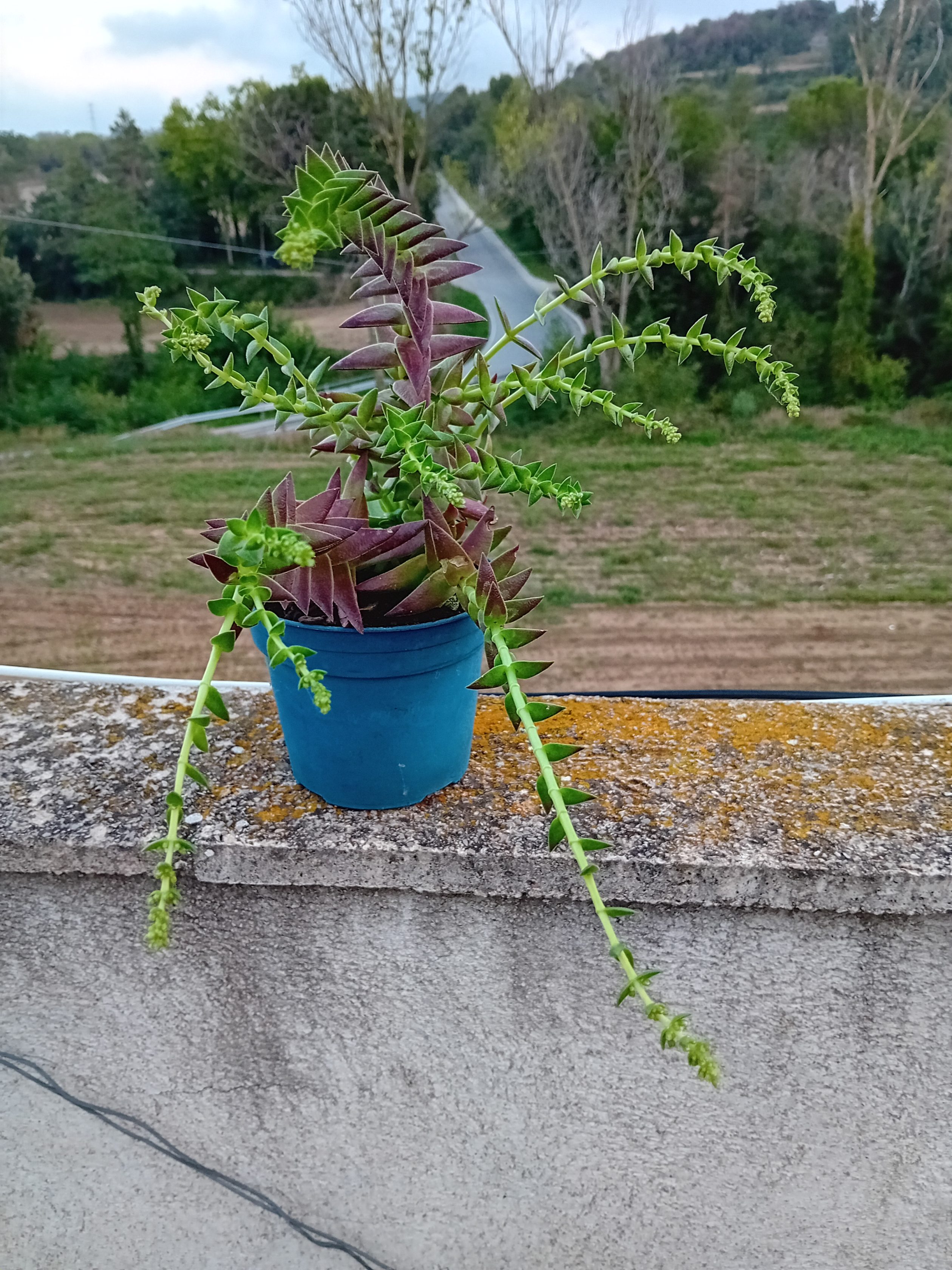 Aquí us presento una crassula d’allò més curiosa a la vegada que maca. Es tracta de la Crassula Capitella Thyrsilora. És originària d’Àfrica del sud i la podem trobar pels sinònims o noms vulgars de suculenta milionària o flama de foc en referència a les tonalitats vermelles que adquireix quan li toca el sol.
