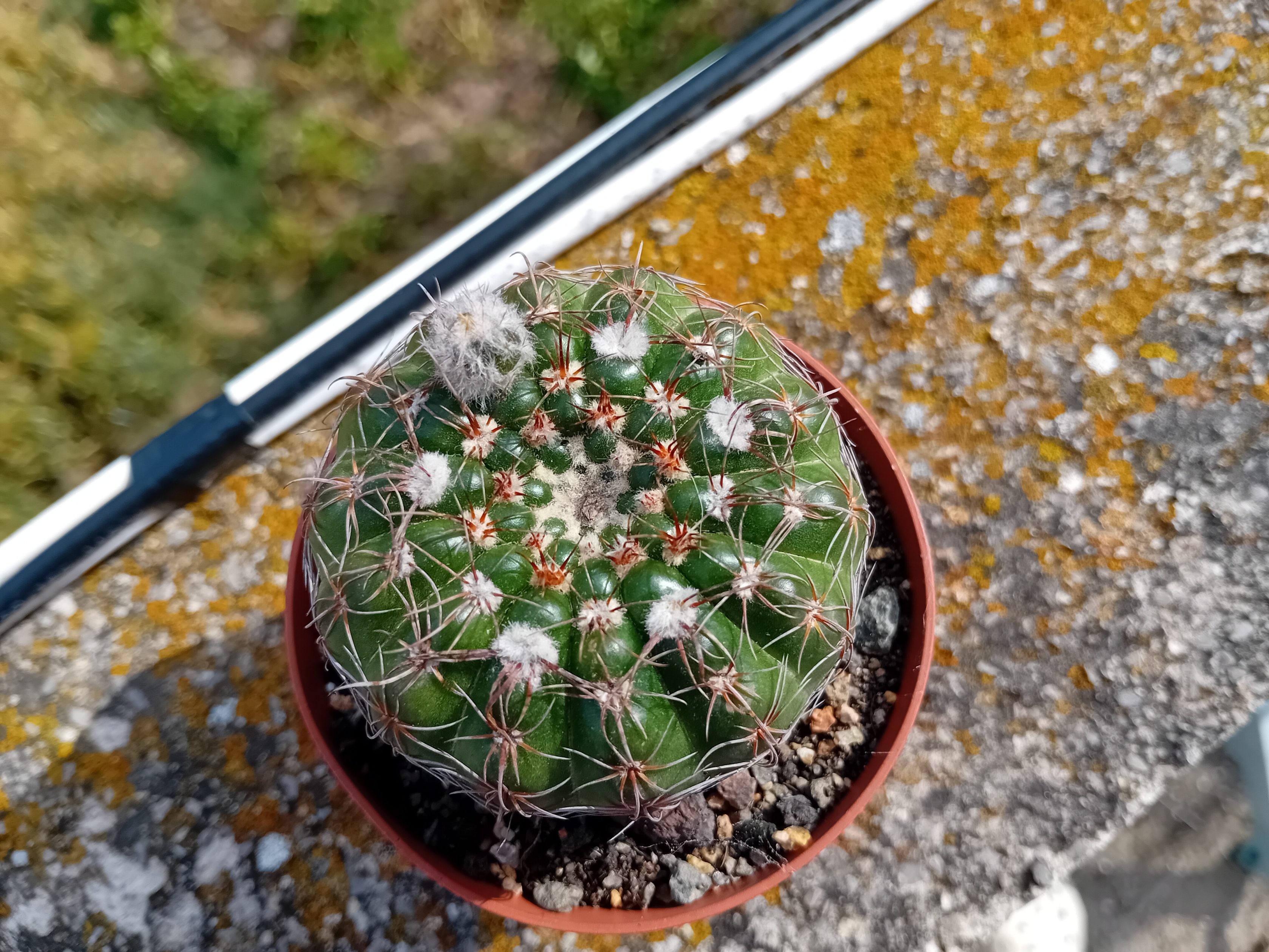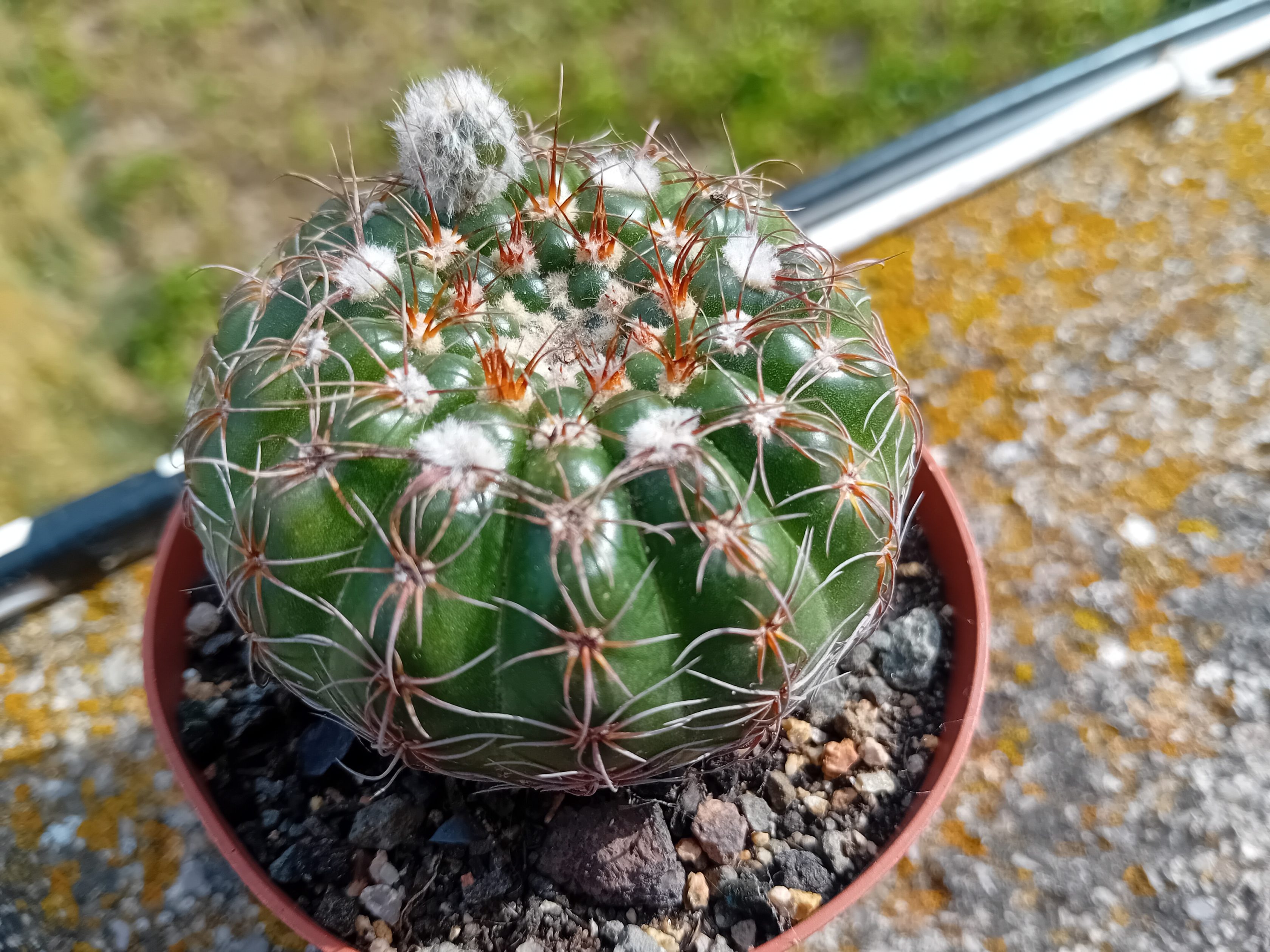 Ara us descriuré una mica com és aquest exemplar. No creix gaire, pot arribar com a molt als dotze centímetres d’alçada, això no vol dir que amb el pas dels anys superi aquesta mesura. Tot i que no és gaire comú, a vegades pot produir fillets que es poden fer servir per crear nous exemplars d’aquesta espècie. Acostuma a tenir entre deu i dotze costelles arrodonides i unes arèoles blanquinoses on podem observar de sis a deu espines radials sense cap espina central que si ens ho mirem bé fan forma d’aranya. Poden florir des de finals de primavera fins a inicis d’estiu, més concretament entre abril i maig. Si estem de sort de poder veure florir aquest Notocactus podem esperar veure unes flors grogues, magenta o vermelles.
