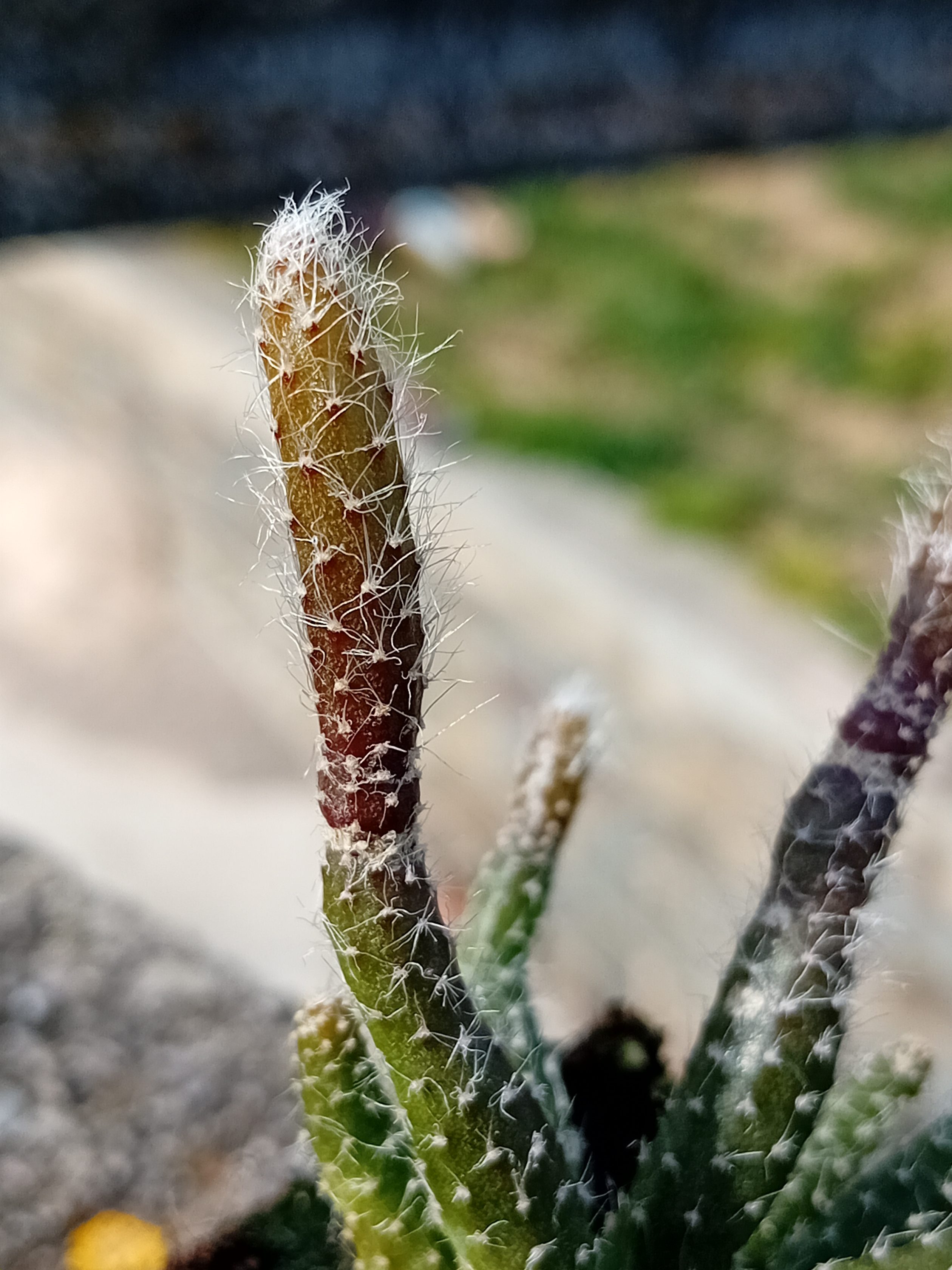 No són gens punxeguts i no tenen ni espines ni agulles. Si ets una mica curiós amb les coses, veuràs que s’assembla una mica a les rastes que porten algunes persones. A mesura que va creixent es va ramificant i si el tens a un test, acabarà sent una planta penjant. Amb el temps a vegades treu arrels aèries que poden facilitar la propagació si en voleu fer esqueixos.